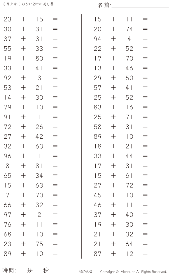 上記のボタンから「くり上がりのない2桁の足し算」の算数数学ドリル・計算ドリル(PDFプリント)がダウンロードできます。個人利用は無料です(家庭以外での配布は有料です)。