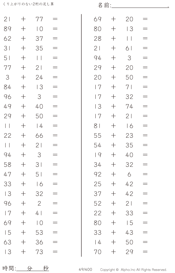 上記のボタンから「くり上がりのない2桁の足し算」の算数数学ドリル・計算ドリル(PDFプリント)がダウンロードできます。個人利用は無料です(家庭以外での配布は有料です)。