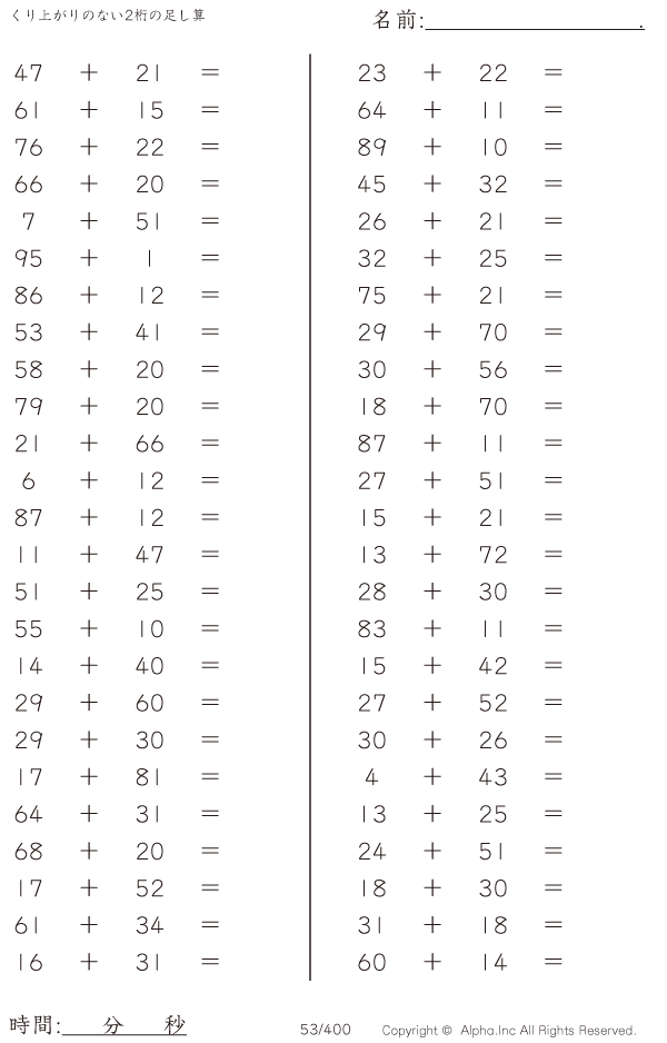 上記のボタンから「くり上がりのない2桁の足し算」の算数数学ドリル・計算ドリル(PDFプリント)がダウンロードできます。個人利用は無料です(家庭以外での配布は有料です)。