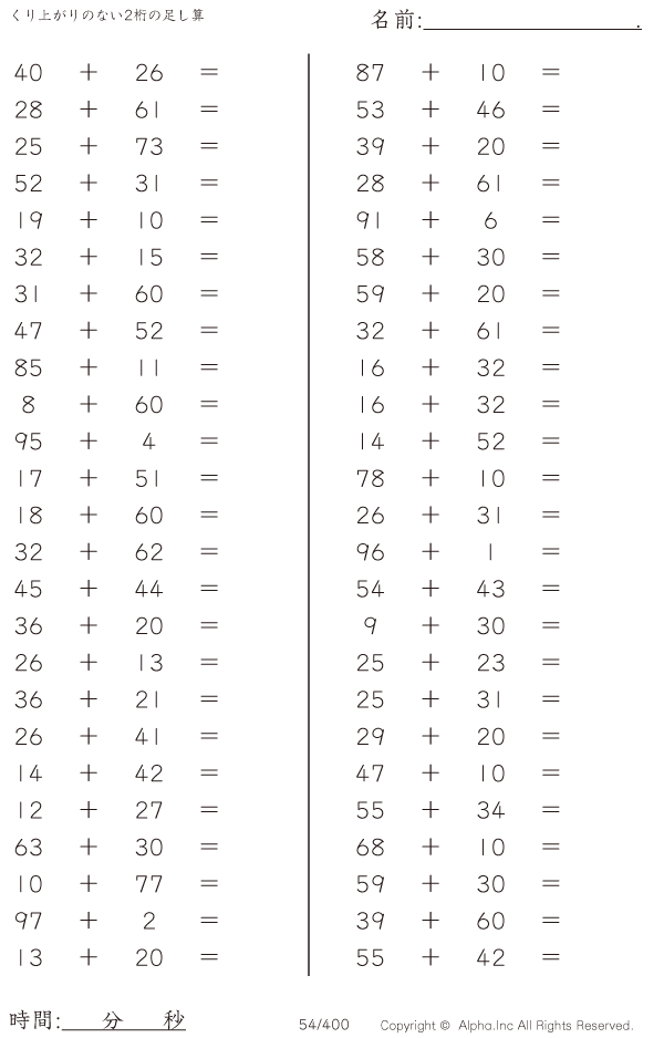 上記のボタンから「くり上がりのない2桁の足し算」の算数数学ドリル・計算ドリル(PDFプリント)がダウンロードできます。個人利用は無料です(家庭以外での配布は有料です)。