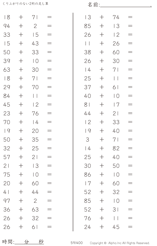 上記のボタンから「くり上がりのない2桁の足し算」の算数数学ドリル・計算ドリル(PDFプリント)がダウンロードできます。個人利用は無料です(家庭以外での配布は有料です)。