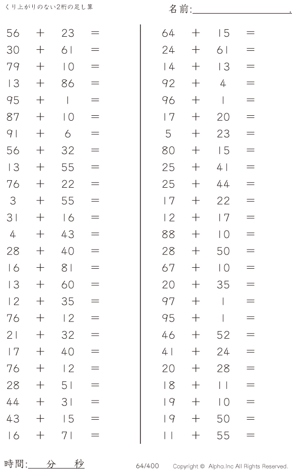 上記のボタンから「くり上がりのない2桁の足し算」の算数数学ドリル・計算ドリル(PDFプリント)がダウンロードできます。個人利用は無料です(家庭以外での配布は有料です)。