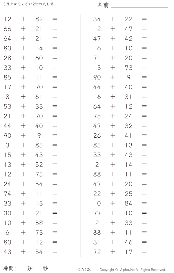 上記のボタンから「くり上がりのない2桁の足し算」の算数数学ドリル・計算ドリル(PDFプリント)がダウンロードできます。個人利用は無料です(家庭以外での配布は有料です)。