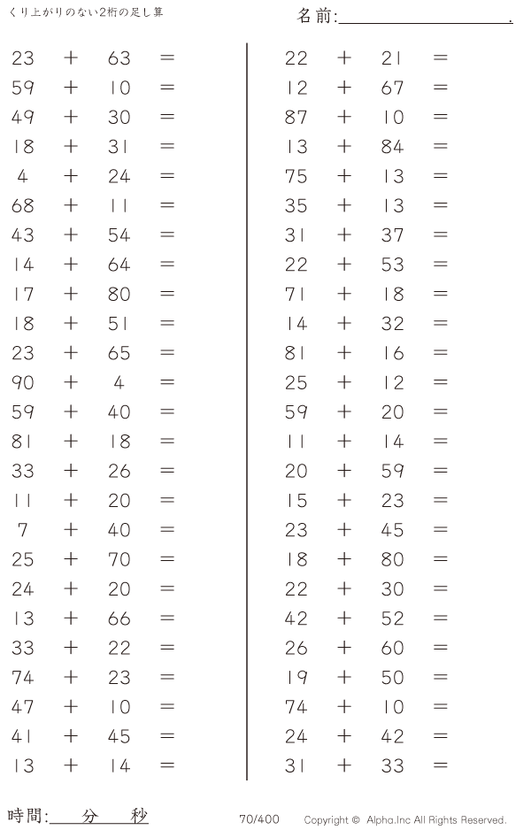 上記のボタンから「くり上がりのない2桁の足し算」の算数数学ドリル・計算ドリル(PDFプリント)がダウンロードできます。個人利用は無料です(家庭以外での配布は有料です)。
