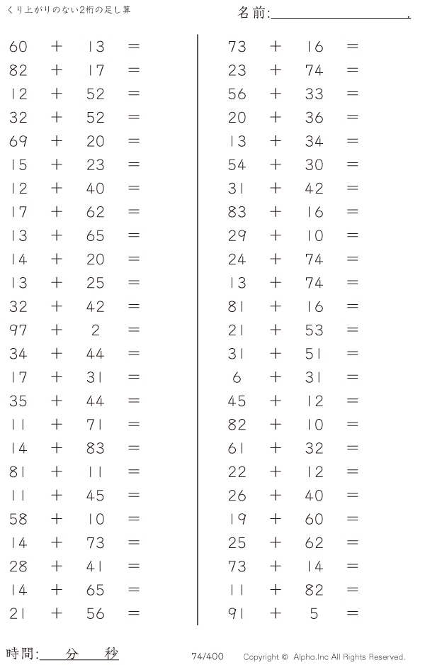 上記のボタンから「くり上がりのない2桁の足し算」の算数数学ドリル・計算ドリル(PDFプリント)がダウンロードできます。個人利用は無料です(家庭以外での配布は有料です)。