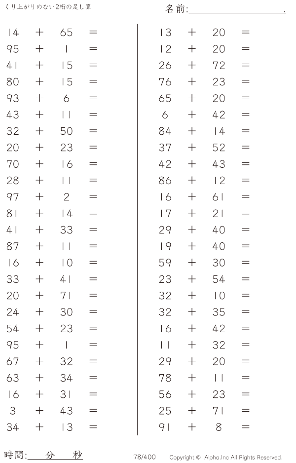 上記のボタンから「くり上がりのない2桁の足し算」の算数数学ドリル・計算ドリル(PDFプリント)がダウンロードできます。個人利用は無料です(家庭以外での配布は有料です)。