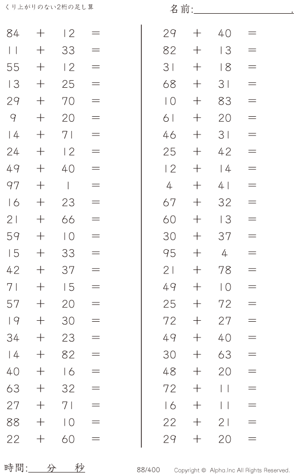 上記のボタンから「くり上がりのない2桁の足し算」の算数数学ドリル・計算ドリル(PDFプリント)がダウンロードできます。個人利用は無料です(家庭以外での配布は有料です)。