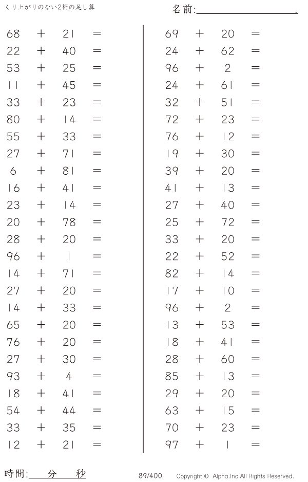 上記のボタンから「くり上がりのない2桁の足し算」の算数数学ドリル・計算ドリル(PDFプリント)がダウンロードできます。個人利用は無料です(家庭以外での配布は有料です)。