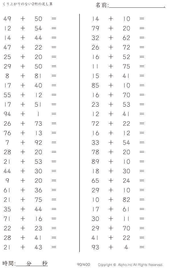 上記のボタンから「くり上がりのない2桁の足し算」の算数数学ドリル・計算ドリル(PDFプリント)がダウンロードできます。個人利用は無料です(家庭以外での配布は有料です)。