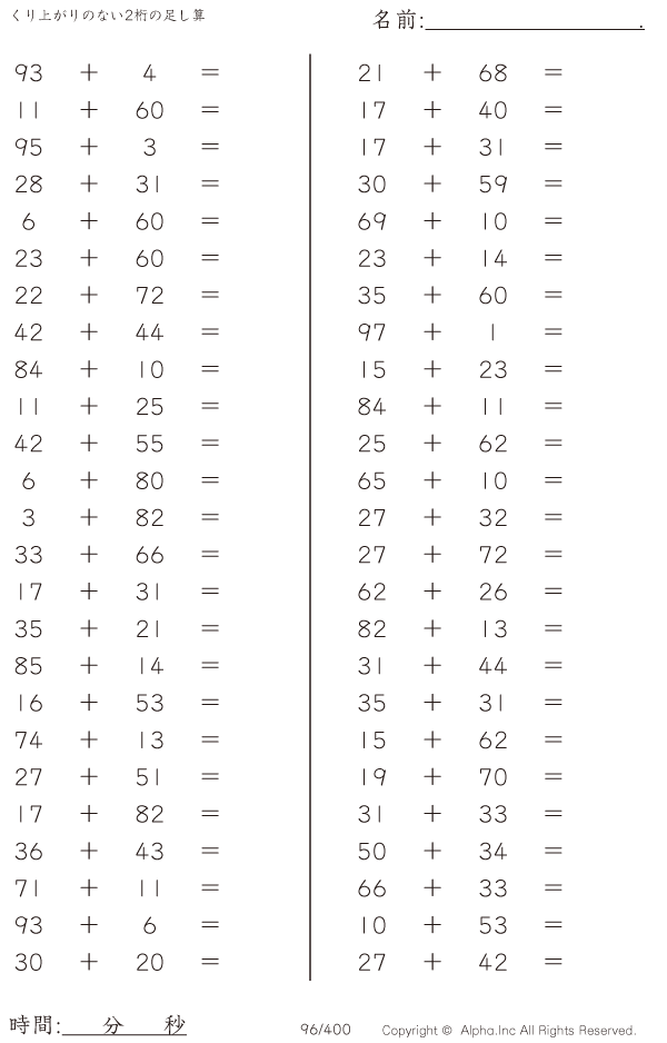 上記のボタンから「くり上がりのない2桁の足し算」の算数数学ドリル・計算ドリル(PDFプリント)がダウンロードできます。個人利用は無料です(家庭以外での配布は有料です)。