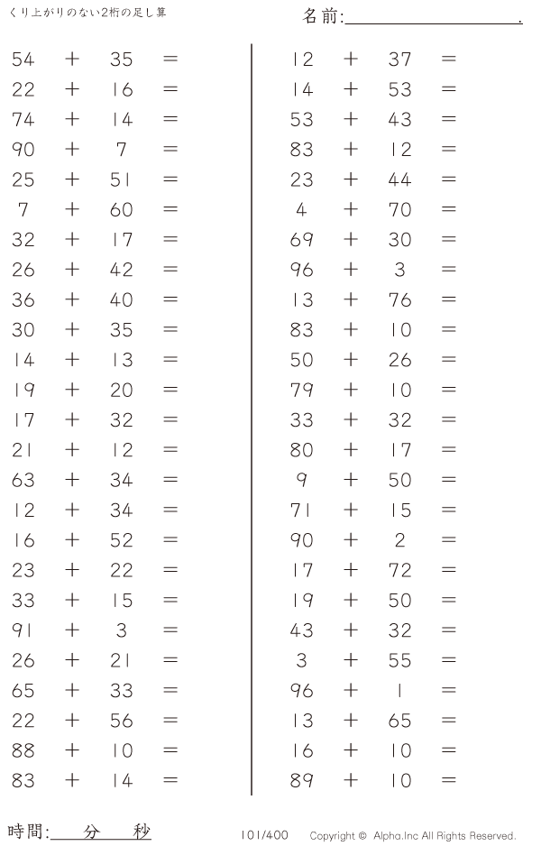 上記のボタンから「くり上がりのない2桁の足し算」の算数数学ドリル・計算ドリル(PDFプリント)がダウンロードできます。個人利用は無料です(家庭以外での配布は有料です)。