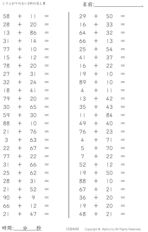 上記のボタンから「くり上がりのない2桁の足し算」の算数数学ドリル・計算ドリル(PDFプリント)がダウンロードできます。個人利用は無料です(家庭以外での配布は有料です)。
