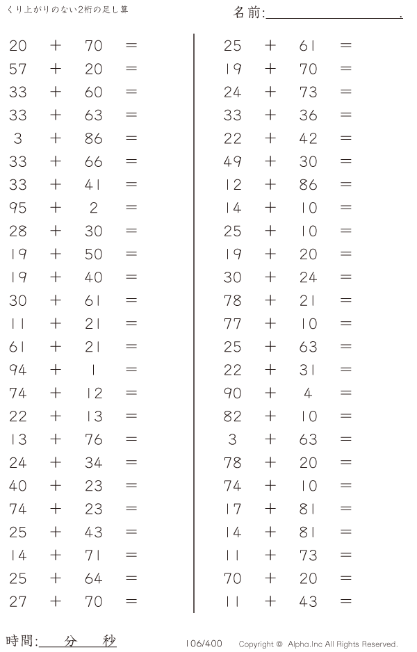 上記のボタンから「くり上がりのない2桁の足し算」の算数数学ドリル・計算ドリル(PDFプリント)がダウンロードできます。個人利用は無料です(家庭以外での配布は有料です)。