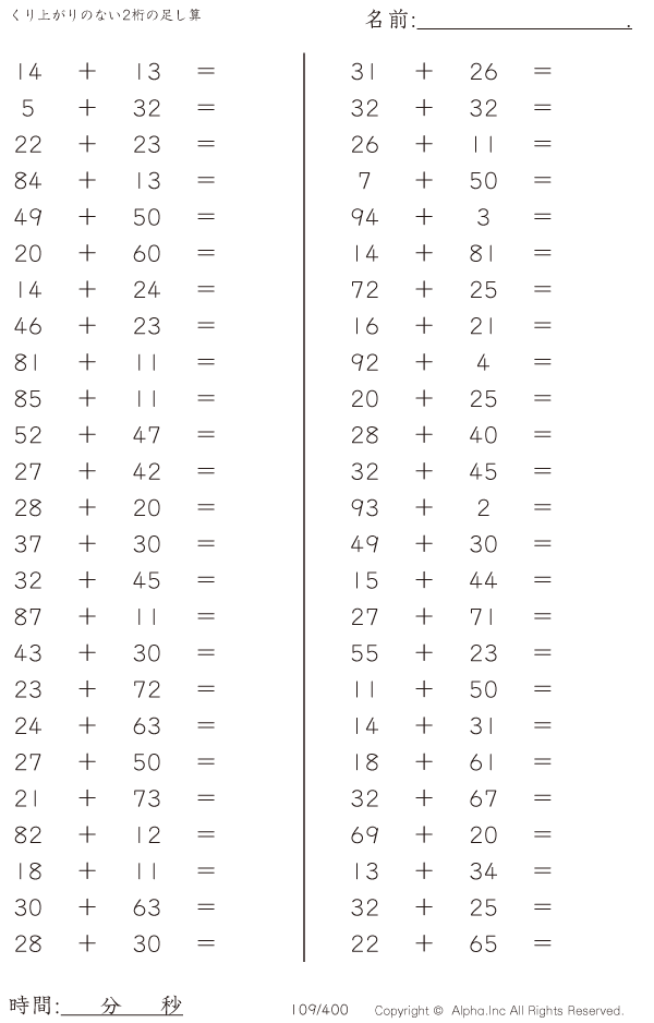 上記のボタンから「くり上がりのない2桁の足し算」の算数数学ドリル・計算ドリル(PDFプリント)がダウンロードできます。個人利用は無料です(家庭以外での配布は有料です)。