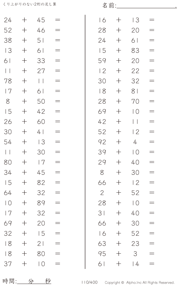 上記のボタンから「くり上がりのない2桁の足し算」の算数数学ドリル・計算ドリル(PDFプリント)がダウンロードできます。個人利用は無料です(家庭以外での配布は有料です)。