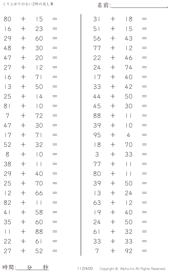 上記のボタンから「くり上がりのない2桁の足し算」の算数数学ドリル・計算ドリル(PDFプリント)がダウンロードできます。個人利用は無料です(家庭以外での配布は有料です)。