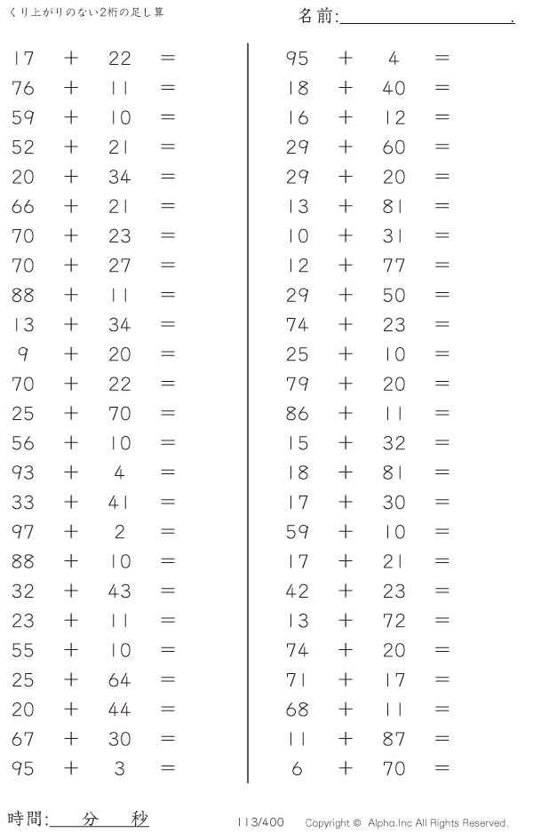上記のボタンから「くり上がりのない2桁の足し算」の算数数学ドリル・計算ドリル(PDFプリント)がダウンロードできます。個人利用は無料です(家庭以外での配布は有料です)。