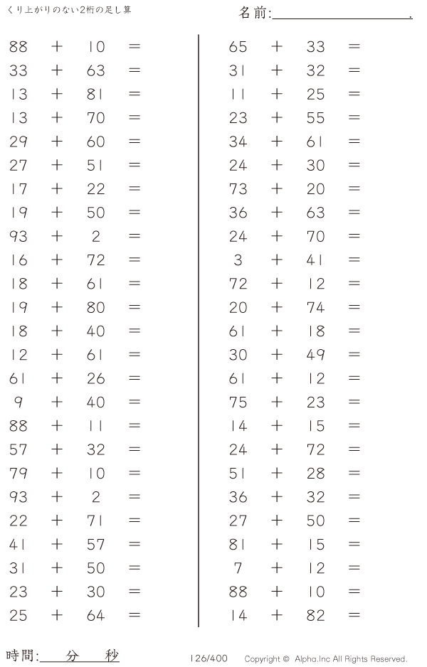 上記のボタンから「くり上がりのない2桁の足し算」の算数数学ドリル・計算ドリル(PDFプリント)がダウンロードできます。個人利用は無料です(家庭以外での配布は有料です)。