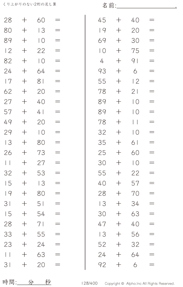 上記のボタンから「くり上がりのない2桁の足し算」の算数数学ドリル・計算ドリル(PDFプリント)がダウンロードできます。個人利用は無料です(家庭以外での配布は有料です)。