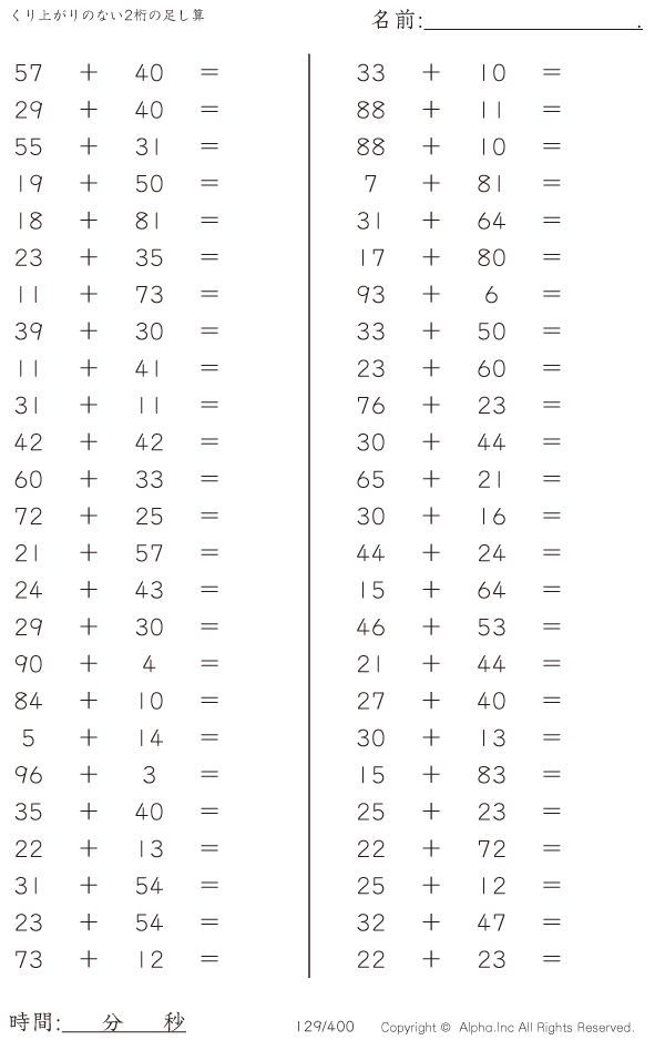 上記のボタンから「くり上がりのない2桁の足し算」の算数数学ドリル・計算ドリル(PDFプリント)がダウンロードできます。個人利用は無料です(家庭以外での配布は有料です)。