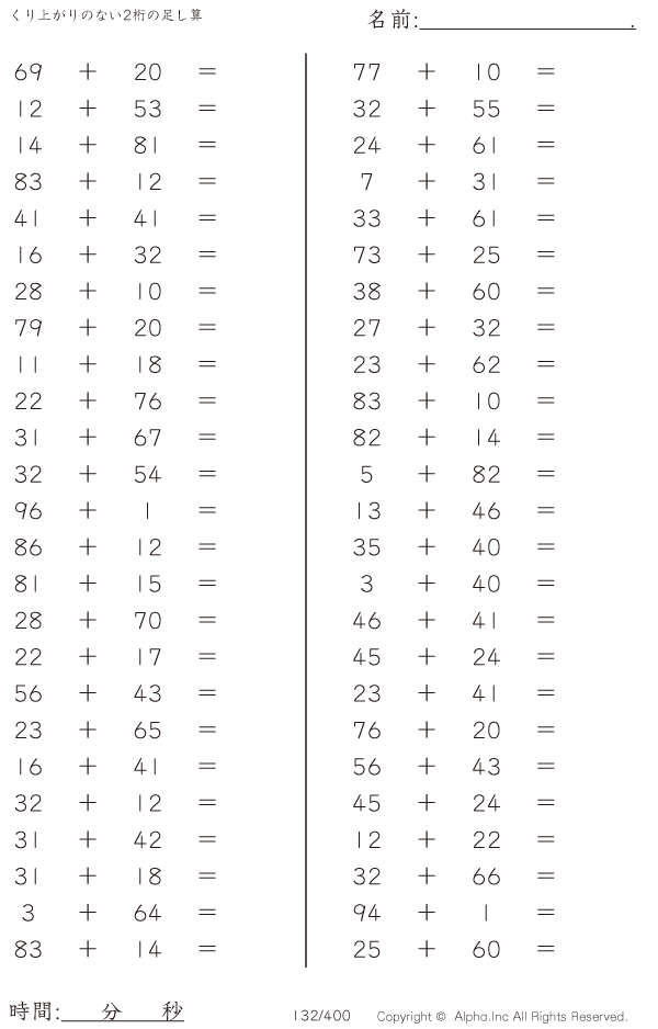 上記のボタンから「くり上がりのない2桁の足し算」の算数数学ドリル・計算ドリル(PDFプリント)がダウンロードできます。個人利用は無料です(家庭以外での配布は有料です)。