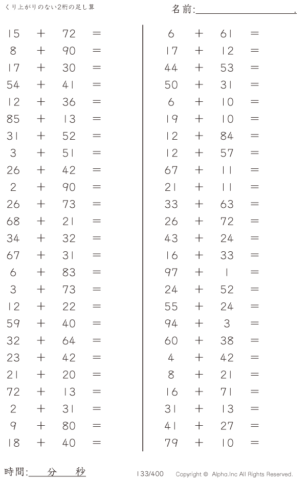 上記のボタンから「くり上がりのない2桁の足し算」の算数数学ドリル・計算ドリル(PDFプリント)がダウンロードできます。個人利用は無料です(家庭以外での配布は有料です)。