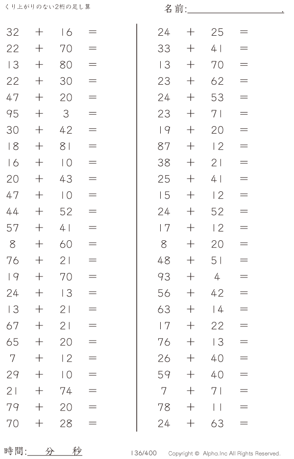 上記のボタンから「くり上がりのない2桁の足し算」の算数数学ドリル・計算ドリル(PDFプリント)がダウンロードできます。個人利用は無料です(家庭以外での配布は有料です)。