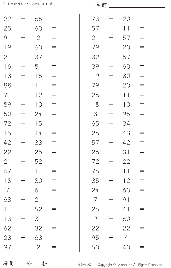 上記のボタンから「くり上がりのない2桁の足し算」の算数数学ドリル・計算ドリル(PDFプリント)がダウンロードできます。個人利用は無料です(家庭以外での配布は有料です)。