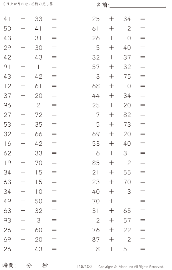 上記のボタンから「くり上がりのない2桁の足し算」の算数数学ドリル・計算ドリル(PDFプリント)がダウンロードできます。個人利用は無料です(家庭以外での配布は有料です)。