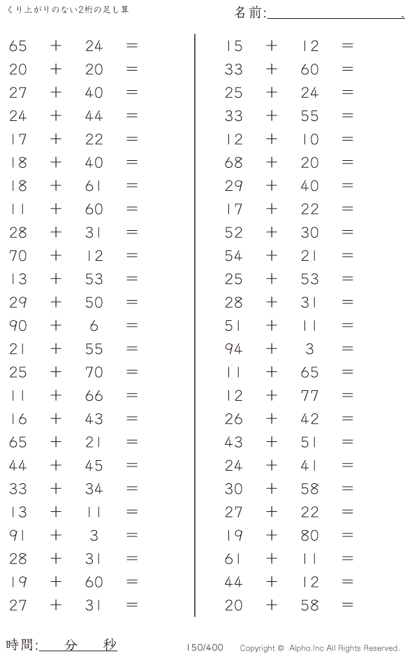 上記のボタンから「くり上がりのない2桁の足し算」の算数数学ドリル・計算ドリル(PDFプリント)がダウンロードできます。個人利用は無料です(家庭以外での配布は有料です)。