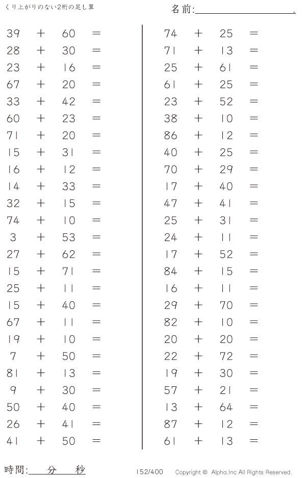 上記のボタンから「くり上がりのない2桁の足し算」の算数数学ドリル・計算ドリル(PDFプリント)がダウンロードできます。個人利用は無料です(家庭以外での配布は有料です)。