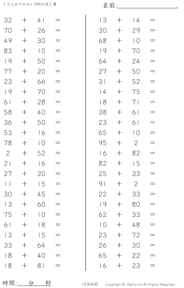 上記のボタンから「くり上がりのない2桁の足し算」の算数数学ドリル・計算ドリル(PDFプリント)がダウンロードできます。個人利用は無料です(家庭以外での配布は有料です)。
