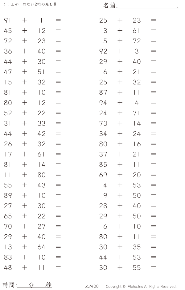 上記のボタンから「くり上がりのない2桁の足し算」の算数数学ドリル・計算ドリル(PDFプリント)がダウンロードできます。個人利用は無料です(家庭以外での配布は有料です)。