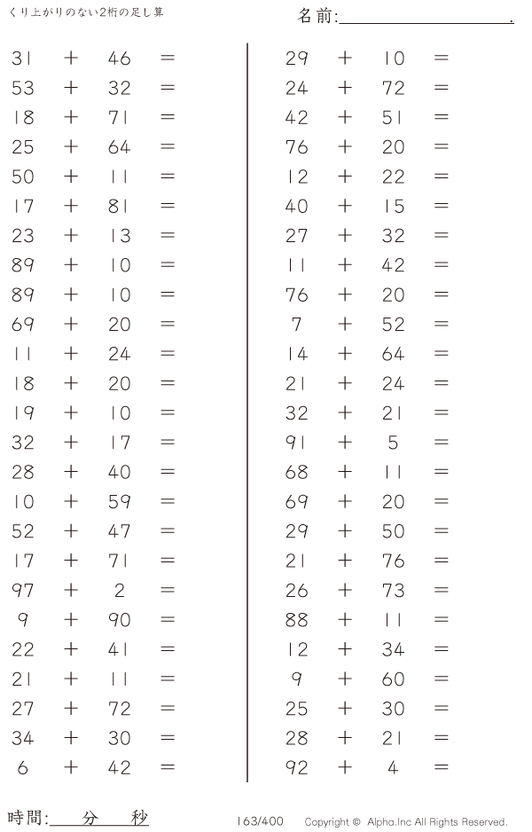 上記のボタンから「くり上がりのない2桁の足し算」の算数数学ドリル・計算ドリル(PDFプリント)がダウンロードできます。個人利用は無料です(家庭以外での配布は有料です)。