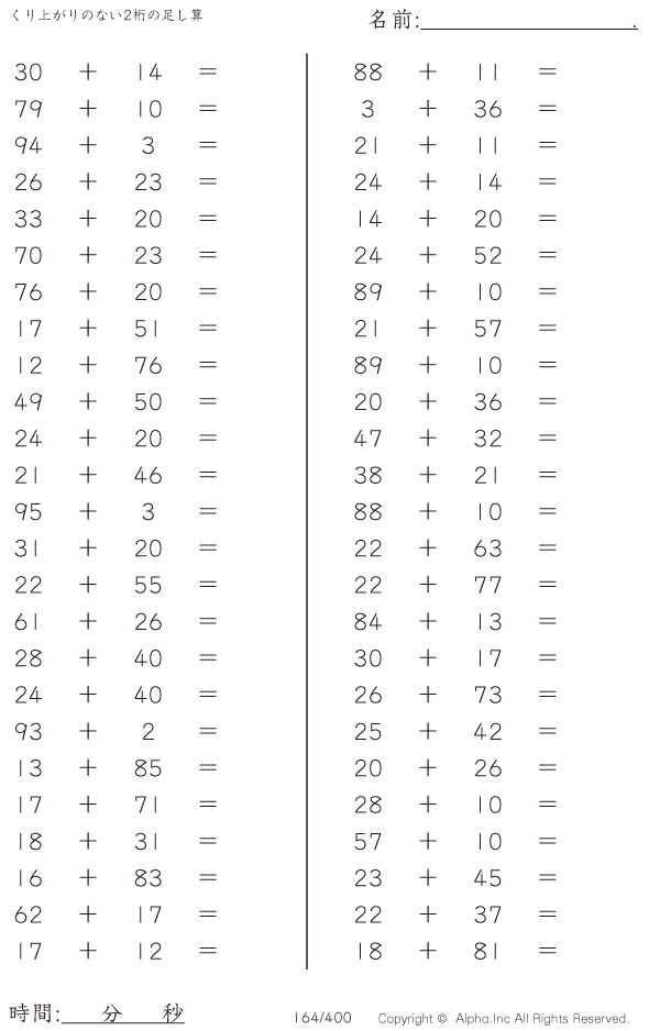 上記のボタンから「くり上がりのない2桁の足し算」の算数数学ドリル・計算ドリル(PDFプリント)がダウンロードできます。個人利用は無料です(家庭以外での配布は有料です)。