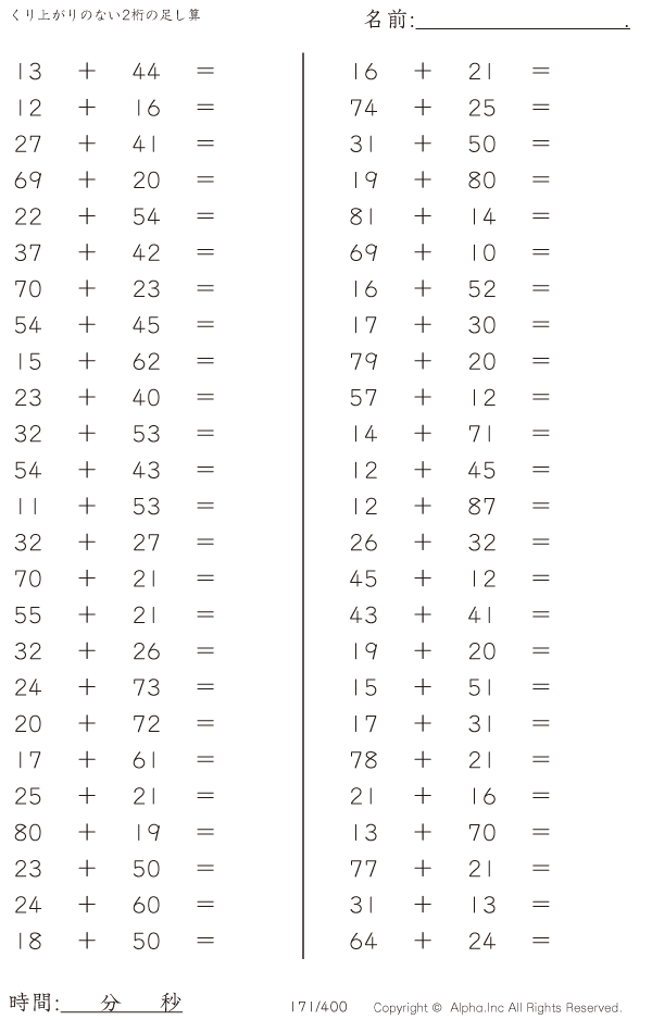 上記のボタンから「くり上がりのない2桁の足し算」の算数数学ドリル・計算ドリル(PDFプリント)がダウンロードできます。個人利用は無料です(家庭以外での配布は有料です)。