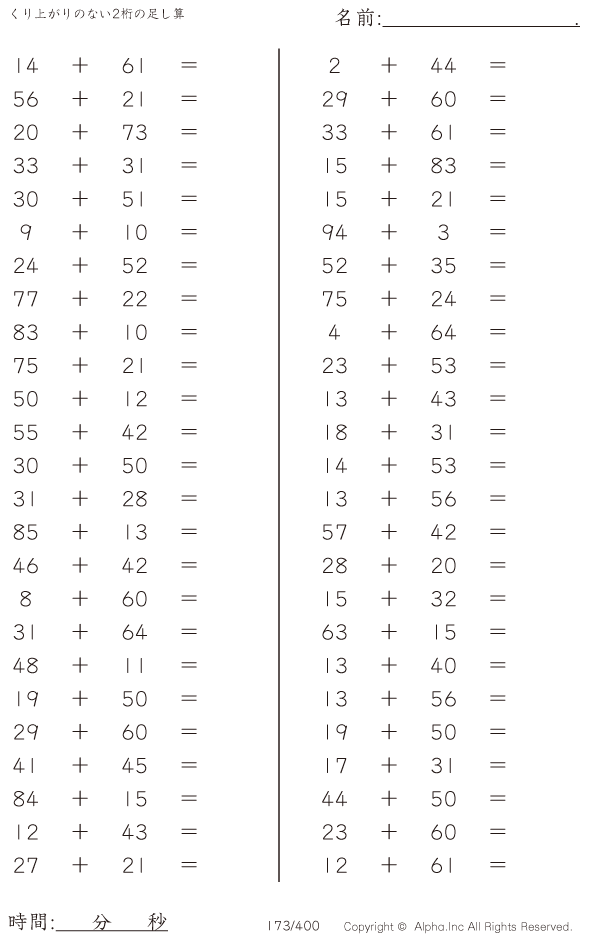 上記のボタンから「くり上がりのない2桁の足し算」の算数数学ドリル・計算ドリル(PDFプリント)がダウンロードできます。個人利用は無料です(家庭以外での配布は有料です)。