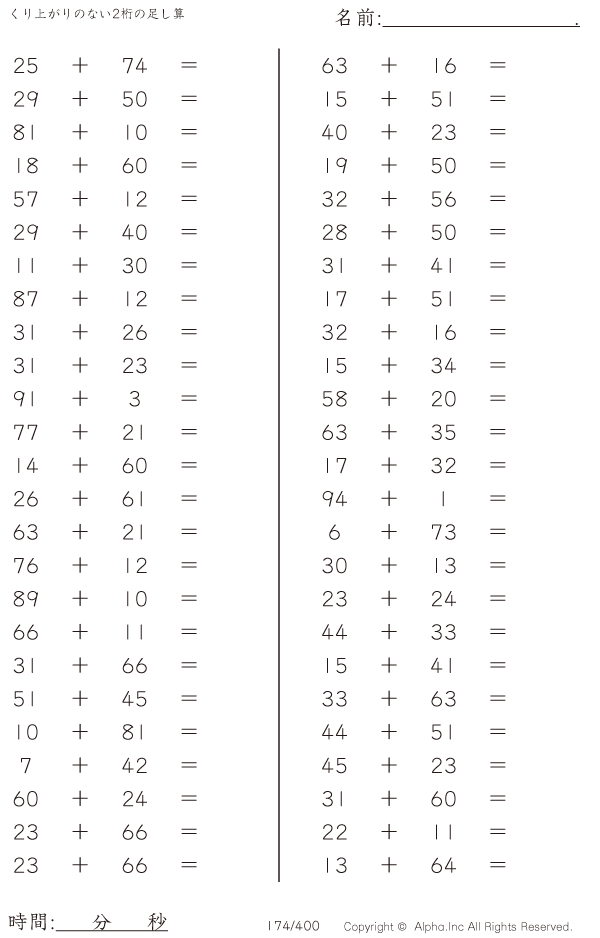 上記のボタンから「くり上がりのない2桁の足し算」の算数数学ドリル・計算ドリル(PDFプリント)がダウンロードできます。個人利用は無料です(家庭以外での配布は有料です)。