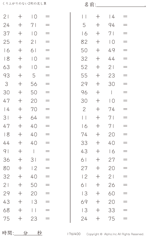 上記のボタンから「くり上がりのない2桁の足し算」の算数数学ドリル・計算ドリル(PDFプリント)がダウンロードできます。個人利用は無料です(家庭以外での配布は有料です)。