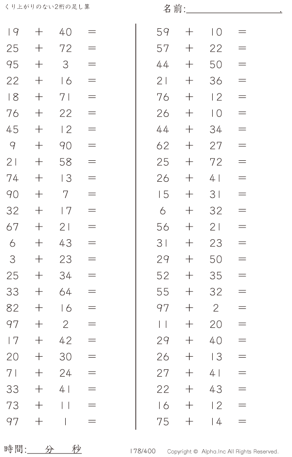 上記のボタンから「くり上がりのない2桁の足し算」の算数数学ドリル・計算ドリル(PDFプリント)がダウンロードできます。個人利用は無料です(家庭以外での配布は有料です)。