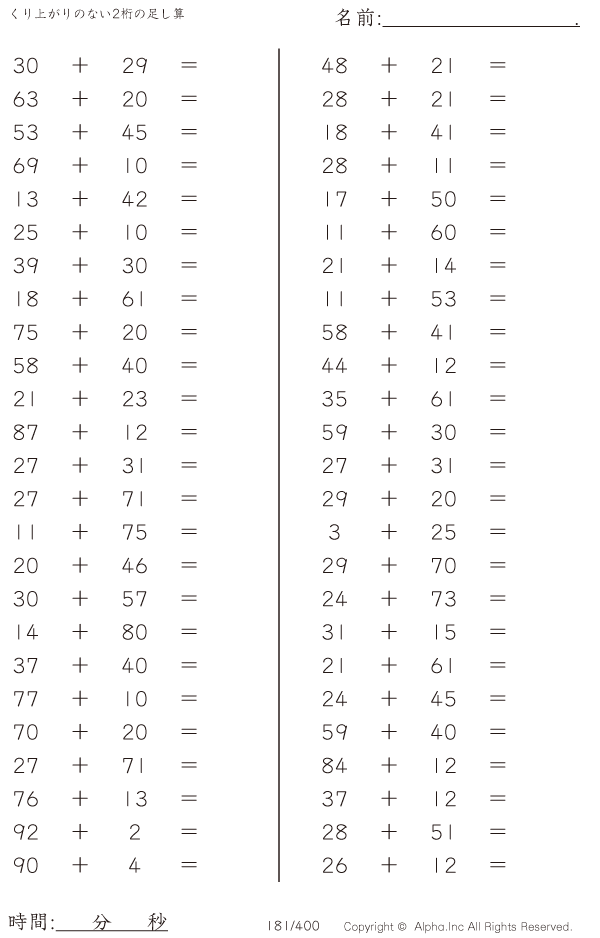 上記のボタンから「くり上がりのない2桁の足し算」の算数数学ドリル・計算ドリル(PDFプリント)がダウンロードできます。個人利用は無料です(家庭以外での配布は有料です)。
