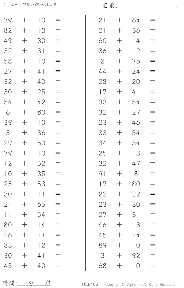上記のボタンから「くり上がりのない2桁の足し算」の算数数学ドリル・計算ドリル(PDFプリント)がダウンロードできます。個人利用は無料です(家庭以外での配布は有料です)。