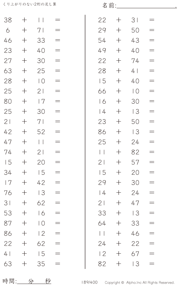 上記のボタンから「くり上がりのない2桁の足し算」の算数数学ドリル・計算ドリル(PDFプリント)がダウンロードできます。個人利用は無料です(家庭以外での配布は有料です)。