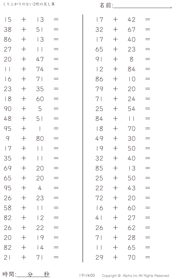 上記のボタンから「くり上がりのない2桁の足し算」の算数数学ドリル・計算ドリル(PDFプリント)がダウンロードできます。個人利用は無料です(家庭以外での配布は有料です)。