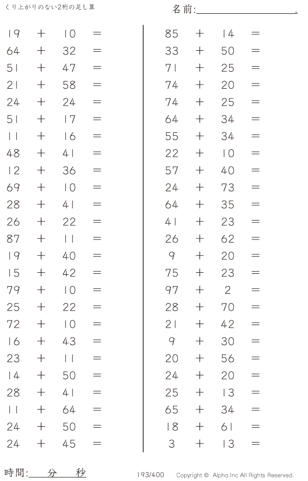 上記のボタンから「くり上がりのない2桁の足し算」の算数数学ドリル・計算ドリル(PDFプリント)がダウンロードできます。個人利用は無料です(家庭以外での配布は有料です)。