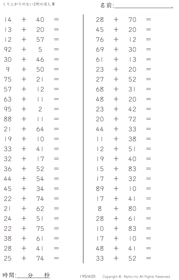 上記のボタンから「くり上がりのない2桁の足し算」の算数数学ドリル・計算ドリル(PDFプリント)がダウンロードできます。個人利用は無料です(家庭以外での配布は有料です)。