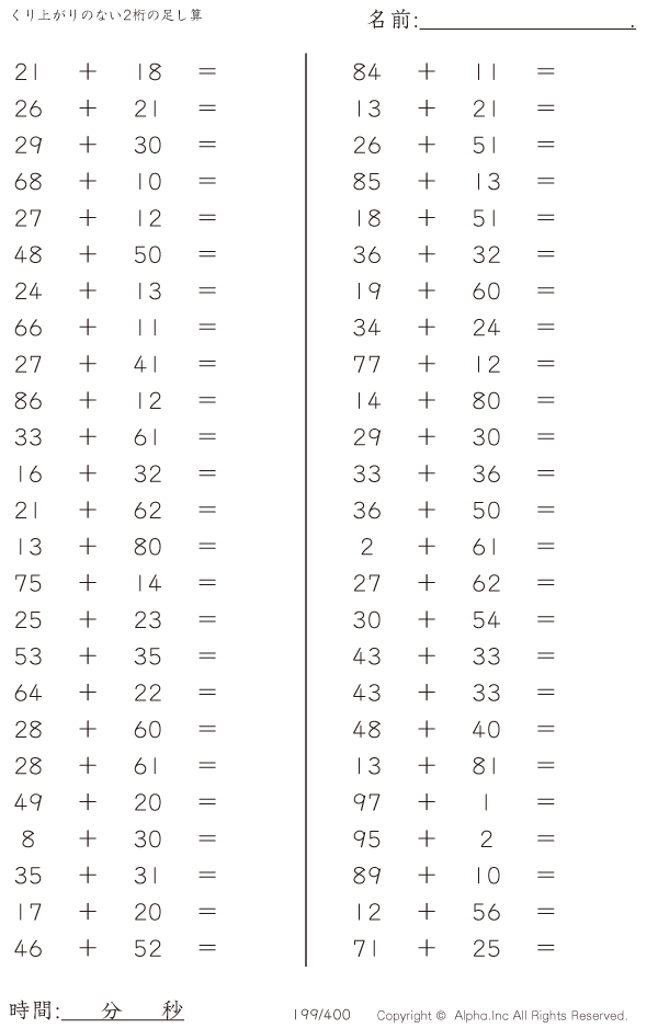 上記のボタンから「くり上がりのない2桁の足し算」の算数数学ドリル・計算ドリル(PDFプリント)がダウンロードできます。個人利用は無料です(家庭以外での配布は有料です)。