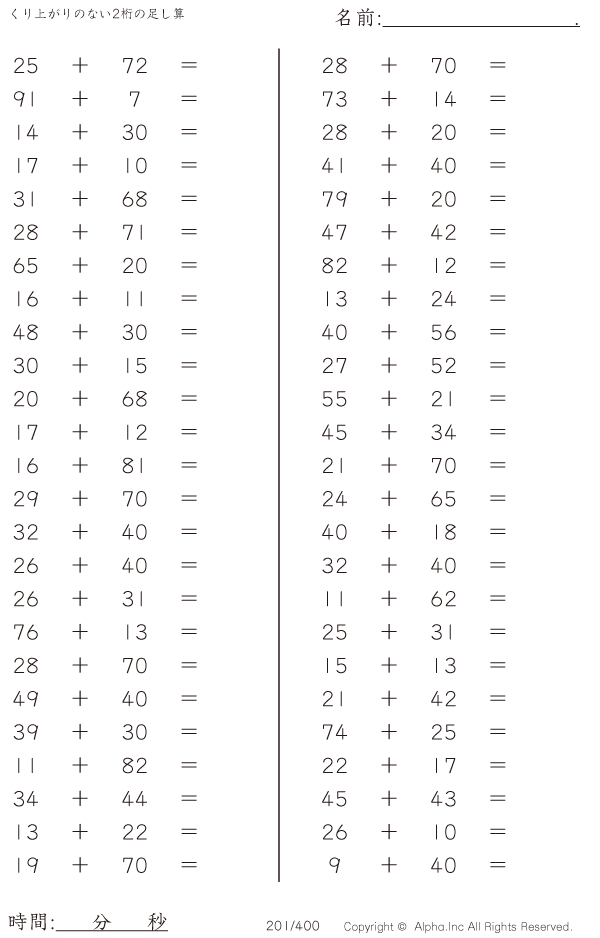 上記のボタンから「くり上がりのない2桁の足し算」の算数数学ドリル・計算ドリル(PDFプリント)がダウンロードできます。個人利用は無料です(家庭以外での配布は有料です)。