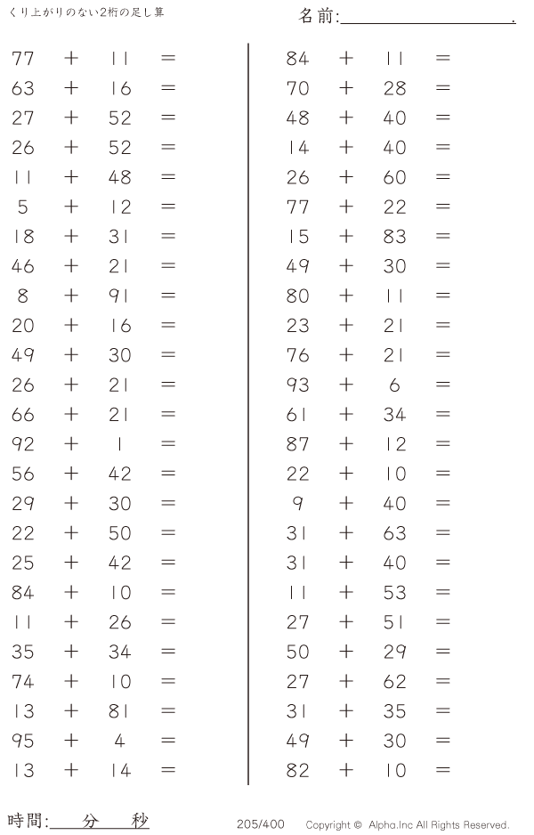 上記のボタンから「くり上がりのない2桁の足し算」の算数数学ドリル・計算ドリル(PDFプリント)がダウンロードできます。個人利用は無料です(家庭以外での配布は有料です)。