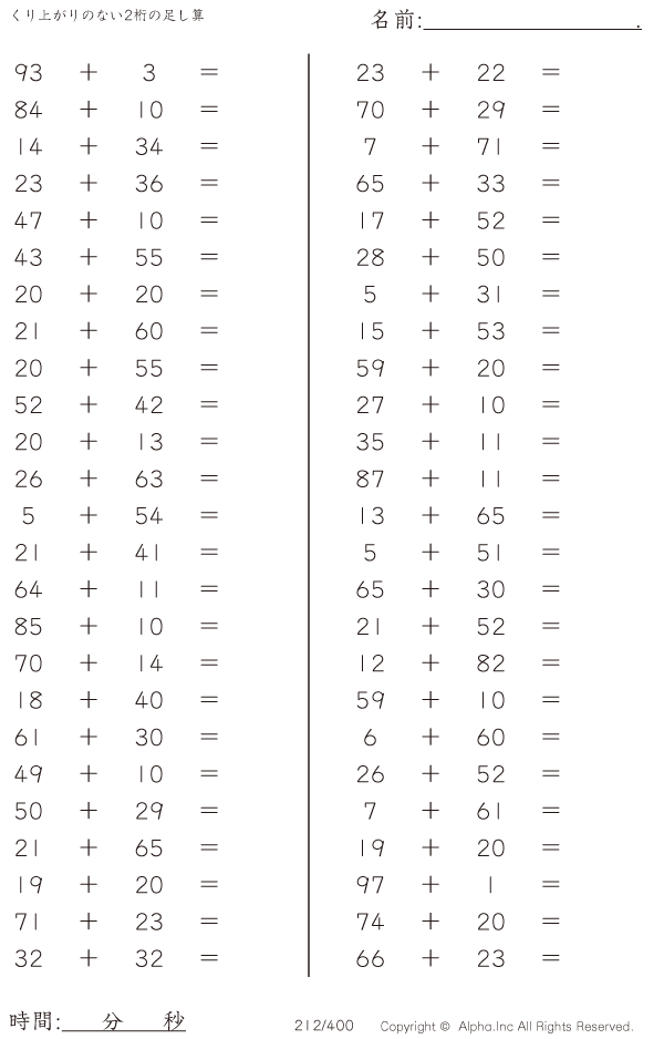 上記のボタンから「くり上がりのない2桁の足し算」の算数数学ドリル・計算ドリル(PDFプリント)がダウンロードできます。個人利用は無料です(家庭以外での配布は有料です)。